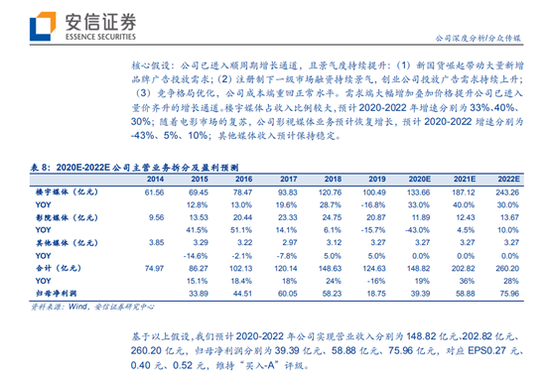 安信证券在2月20日研报中表示,公司已进入顺周期增长通道,且景气度持续提升:(1)新国货崛起带动大量新增品牌广告投放需求;(2)注册制下一级市场融资持续景气,创业公司投放广告需求持续上升;(3)竞争格局优化,公司成本端重回正常水平。需求端大幅增加叠加价格提升公司已进入量价齐升的增长通道。预计 2020-2022 年公司实现营业收入分别为 148.82 亿元、202.82 亿元、260.20 亿元,归母净利润分别为 39.39亿元、58.88 亿元、75.96 亿元,对应 EPS0.27 元、0.40 元、0.52 元,维持“买入-A”评级。