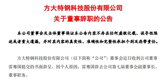 而就在一天前,9月6日晚间,方大特钢公告称,雷骞国因个人原因,辞去公司第七届董事会副董事长、董事职务。