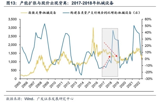 ●从行业角度看,科技成长行业的产能扩张与股价会出现背离吗?(1)典型科技成长行业如医药生物、电子、电力设备等,产能扩张与股价相关性较为明显,如2014-2021年的电力设备、2019-2022年的电子、2013-2015年的汽车等。(2)产能扩张与股价出现明显背离的情况一般发生下游需求不振的时期,导致上游供给扩张无法被完全消化,供需格局出现恶化,如2011-2012年的通信,以及2017-2018年的机械设备等。