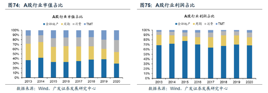 同时,A股内部的市值结构和利润结构也存在一定程度的扭曲。在A股上市公司的市值结构中,金融地产和周期行业的占比相对较高,而消费和TMT的占比相对较低;在A股上市公司的利润结构中,金融地产和周期行业的占比进一步抬升,而消费和TMT行业的利润占比被进一步挤压。我们认为:消费和科技行业的市值结构已经有所“均衡化”(热门股抱团),但消费和科技行业的利润结构则依旧扭曲(上市结构不均衡导致的)。随着注册制的逐步推进,将会有更多优秀的消费和科技类公司上市,进一步均衡A股的市值结构和利润结构。