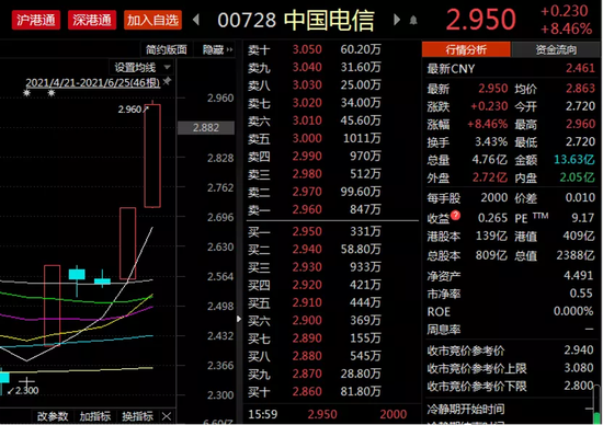 中国电信的暴涨是从6月21日开始的,当日涨幅11.16%。随后在6月24日大涨6.64%,6月25日再次大涨8.46%。