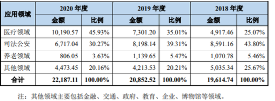 报告期内公司的主要营业收入来自医疗领域、司法公安,两者在2020年占比高达75%以上,另外有一小部分收入来自养老领域,占比2020年营收不到4%。医疗领域占比逐年大幅提升,由2018年占营收比重25.07%提升至2020年的45.93%;养老领域则呈下滑态势,由2018年的5.46%降至2020年的3.63%。