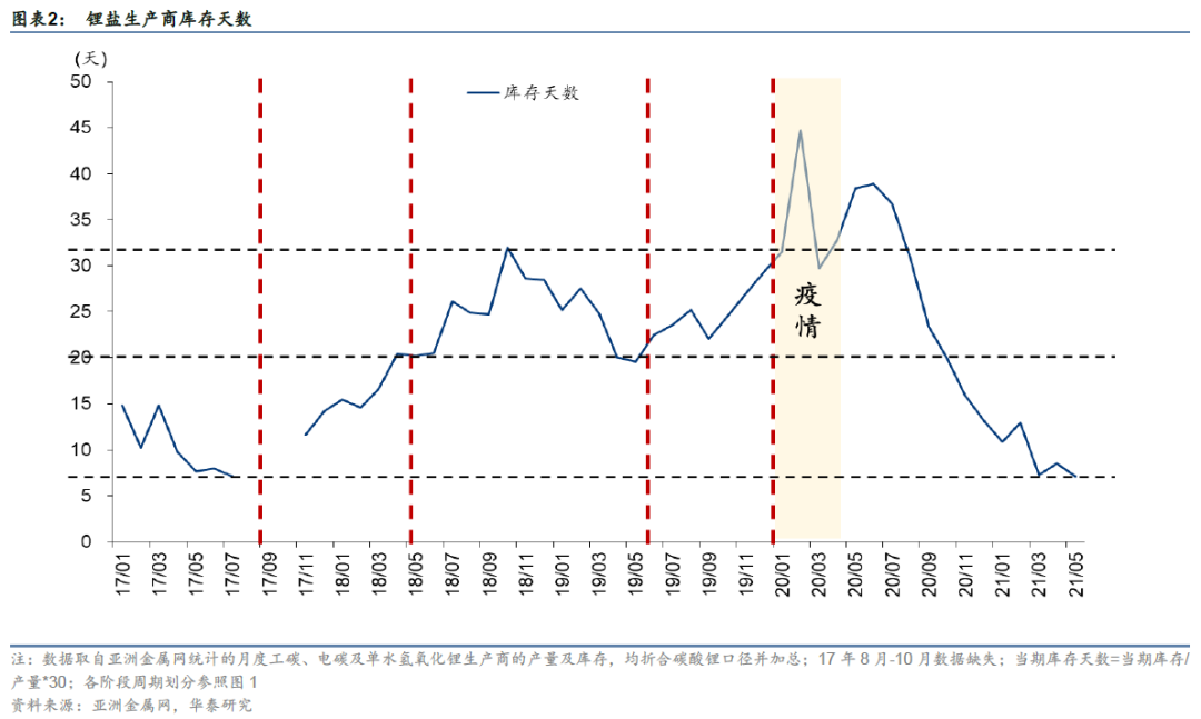 1)目前行业供需两旺,锂盐生产商处于被动去库阶段,如果以“库存/产量*30”来表示库存天数,截至21年5月中国锂盐生产商库存天数约7天,接近17年至今最低点;