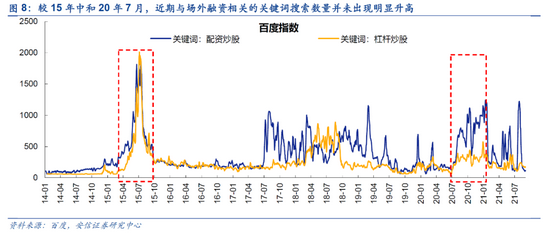 自2020年下半年起,市场中融资融券资金持续上行,截至9月2日,两融余额高达18735亿元,为近5年最高点且已接近15年高点水平。不可否认,两融资金的迅速增长为市场带来了一定的增量资金,但值得注意的是,从两融交易额占A股成交额日度数据看,占比并未显著提升:上半年两融交易额占A股交易额比例为9.36%,而7月至今占比却降低了0.25个百分点,为9.11%。由此推断,虽当前市场两融资金处于不断增长、刷新高位的态势,但交易额比例却仍处于正常范围内,对近月以来A股连续破万亿成交额的解释力度亦有限。