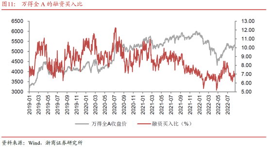融资买入比对中期顶部更为敏感,通常与市场同步见顶,因此观测其极值较为重要。2019年以来处于5%至12%区间。今年以来市场下行,融资买入比同样逐步下行,近期同样低位企稳。