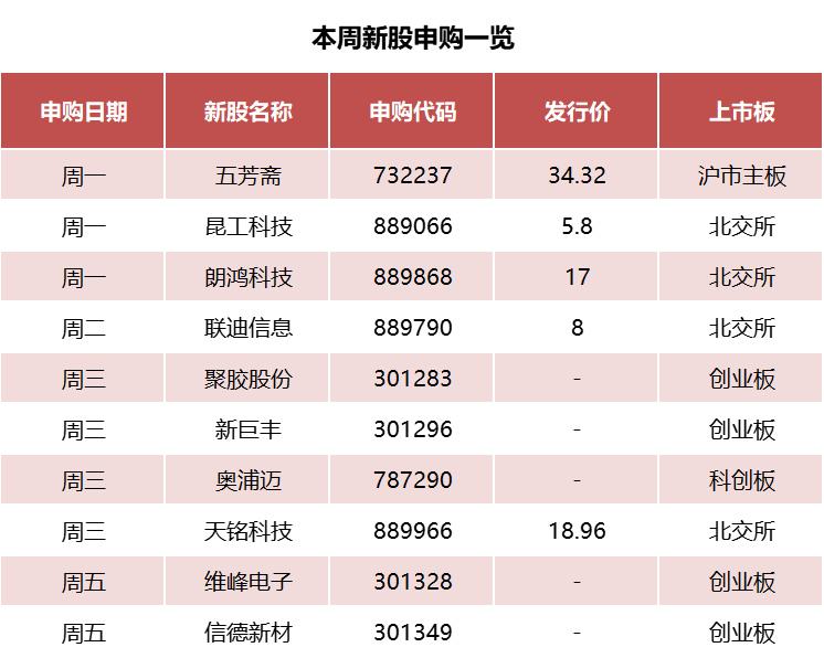 根据新股发行安排,本周有10只新股申购。其中,百年老店五芳斋将在周一进行新股申购。