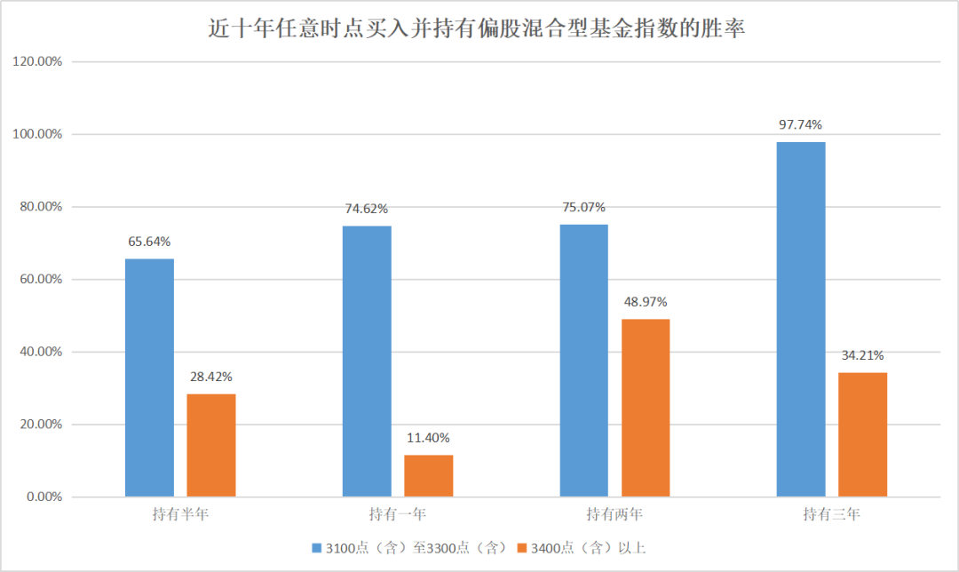 统计数据显示,3100点至3300点买入并持有偏股混合型基金指数,整体胜率明显优于3400点以上买入并持有该指数。