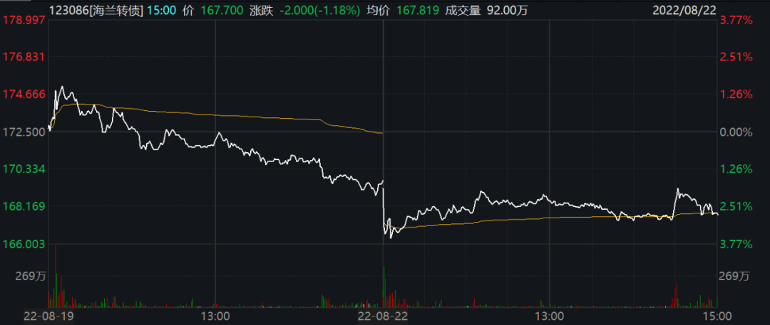 来源:上市公司公告按照海兰转债8月22日167.70元的收盘价计算,如果投资者不在23日收市前操作,损失可能超过40%。