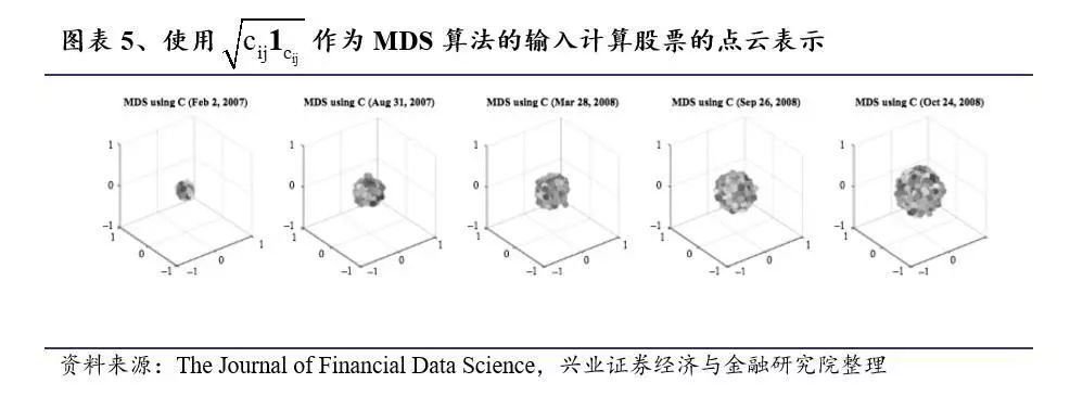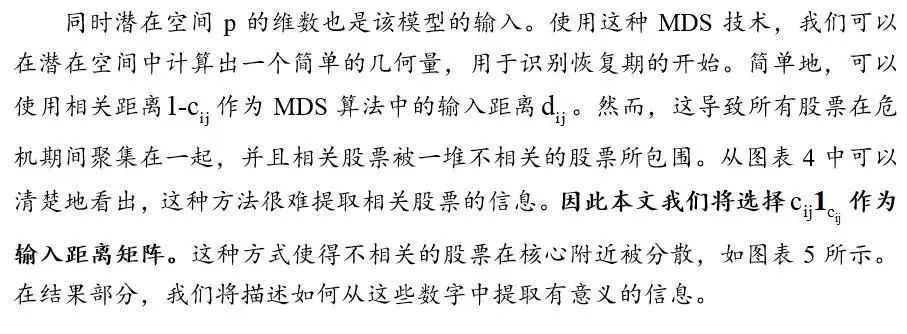 我们还采用多维缩放(MDS)技术来提取低维潜在空间中的股票。潜在空间中股票的点云呈现球的形状。在危机期间,这个球的半径增加,并且在恢复附近开始减小。基于Billio等人(2010)和Kritzman等人(2011)的研究,我们推测球体的半径很有可能与相关矩阵的特征值有关,但本文并不打算识别这种关系。主要原因如下: