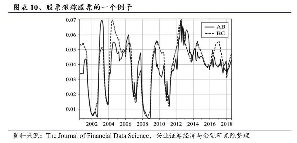 在危机期间,股票市场受到少数金融因素的影响,导致股票之间的集体行为(Billio等人,2010; Kritzman等人,2011)。图表9的热图证实了这一想法。虽然股票走势的方向可以由一小部分金融因素决定,但人们预计股票对这些因素的反应时间会有所不同(实际上,幅度也可能不同)。响应时间的滞后将导致股票在因素(物理经济因素)空间中跟踪股票。我们观察到可以在潜在空间中观察到这种跟踪行为。图表10显示,在危机期间,某些股票在时间t和t-1的潜在仓位之间的滞后距离减少,这表明每对中的一只股票正在跟踪另一只股票。