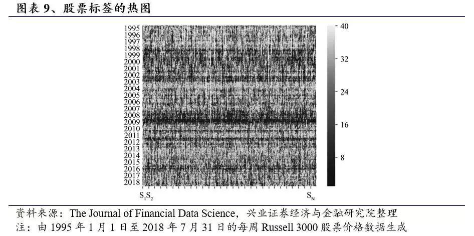 图表9为股票标签的热图。在该热图中,图中每个点的颜色表示给定时间(垂直轴)的每只股票(横轴)的标签。较暗的阴影表示较小的标签,较亮的阴影表示较大的标签。如果当天没有股票的价格数据,则该点的颜色设置为白色。