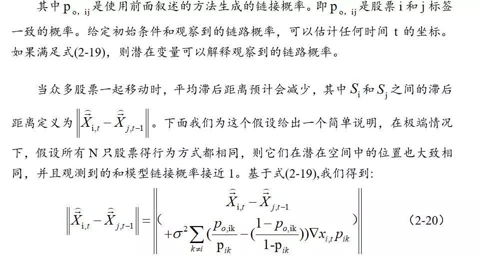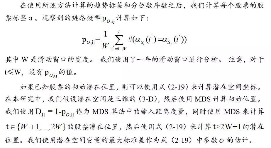 在这个动态网络模型中,每个股票根据其短期趋势,长期趋势和横截面排名分配一个离散标签。然后使用这些标签构建动态网络。观察该特定网络的概率用潜在维度的距离表示。如果股票的潜在维度接近,则两条股票通过边缘(具有相同标签)连接的概率更高。假设潜在变量遵循马尔可夫过程,我们得出在较早时间给定潜在位置观察图的概率。然后通过最大化观察使用标签生成的网络的可能性来确定潜在空间中的股票的位置。然后,我们计算所有股票对之间的滞后距离(其中滞后距离是时间t处的股票i与时间t-1处的股票j之间的距离)。我们观察到,在危机期间,股票之间的滞后距离平均下降,导致股票走向潜在空间中的其他股票。股票的这种移动类似于在社交网络中观察到的跟踪行为的模式。