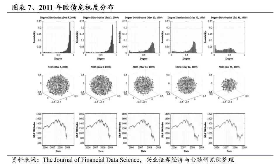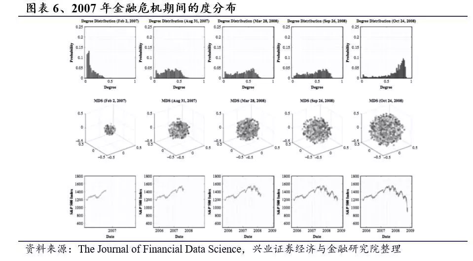 在图表7中,随着市场在2008年末进一步走跌,度分布的偏度变得更加负,并且峰度值增加。点云在此期间具有大的半径。随后,市场下行趋势缓和,并在2009年初开始减弱。随着危机的缓解,度分布虽然仍然是负面偏离,但却向左侧移动。随着恢复的继续,分布的形状变平,分布的峰度减小。随着市场反弹并开始从危机中恢复,度的最大值也逐渐减小。与此同时,点云的半径达到最大值并开始恢复。在市场完全恢复之后,(危机后)程度分布和点云表示最终会回到危机前的状态。
