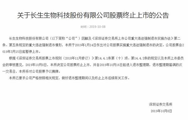 公告显示,长生生物科技股份有限公司因触及《深圳证券交易所上市公司重大违法强制退市实施办法》第二条、第五条规定的重大违法强制退市情形,深交所于2019年1月14日作出对公司股票实施重大违法强制退市的决定。公司股票自2019年3月15日起暂停上市。