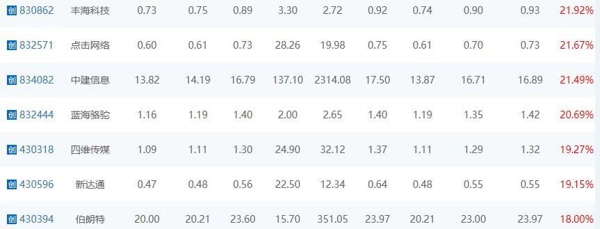 具体来看,采取集合竞价转让方式的股票,部分个股在尾盘撮合竞价出现涨停,远翔新材、富岛科技收盘涨幅均为100%;乐创教育大涨87.56%,汇博医疗涨超80%,创新层股票赛肯思、宇球电子、巴鲁特、东创科技4只个股分别上涨逾50%。