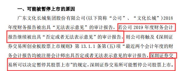 10月30日晚间,文化长城发布公告称,公司股票存在可能被暂停上市的风险。主要是因为2018年度财务报告被出具“无法表示意见”的审计报告,若公司 2019 年度财务会计报告继续被出具“否定或者无法表示意见”的审计报告,深交所可以决定暂停其股票上市。