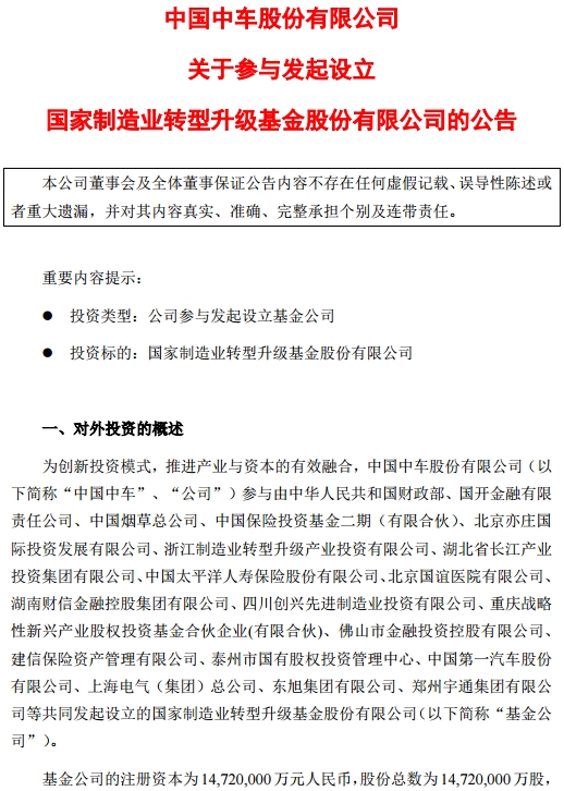 11月18日晚间,中国中车发布公告,公司参与发起设立国家制造业转型升级基金股份有限公司,基金公司的注册资本为1472亿元。