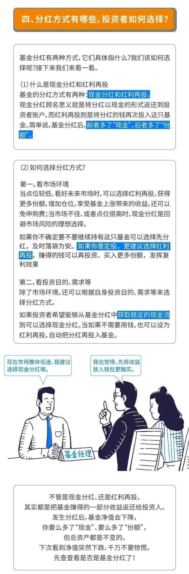(2)在市场低迷或者点位较高时,可以选择现金分红,将利润早点收入到我们的钱包中;在市场向好或者点位较低时,可以选择红利再投的方式增加持有的份额。