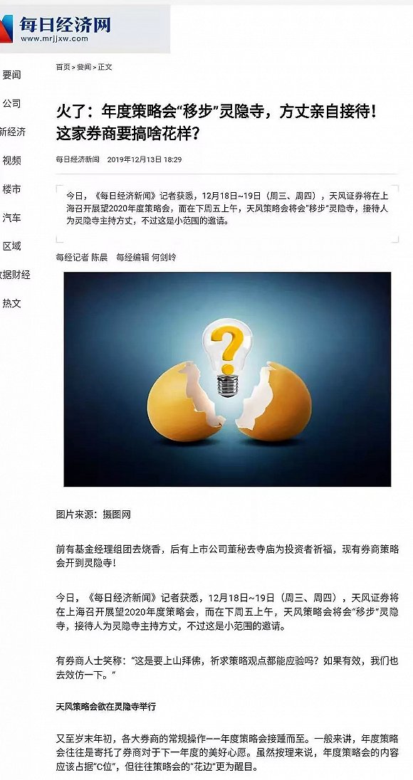 据灵隐寺微信公号介绍,2019年12月13日18时29分,《每日经济新闻》记者陈晨在《每日经济网》首页要闻栏刊发1700多字的署名消息说:“12月18日-19日(周三、周四),天风证券将在上海召开展望2020年度策略会,而在下周五上午,天风策略会将会“移步”灵隐寺,接待人为灵隐寺主持方丈,不过这是小范围的邀请。”