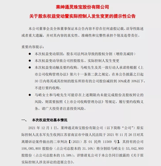 2021年12月2日晚间,莱绅通灵发布了关于原实际控制人涉及诉讼的进展公告以及关于股东权益变动暨实际控制人发生变更的提示性公告。根据公告,12月1日,莱绅通灵原实际控制人沈东军收到江苏省南京市中级人民法院于11月26日对其离婚诉讼案件做出的二审判决,其持有的公司31.16%的股份将分割给马峭一半,占公司总股本的15.58%。本次权益变动将导致公司控股股东、实际控制人发生变化。马峻及其一致行动人合计控制上市公司48.45%的股份。