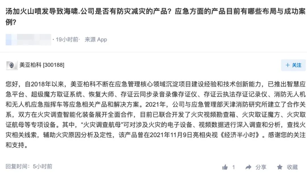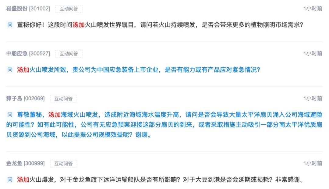 汤加海底火山喷发后,投资者在第一时间去互动平台问询上市公司业务所受影响。多数上市公司暂未回复,部分回应称对业务影响较小。