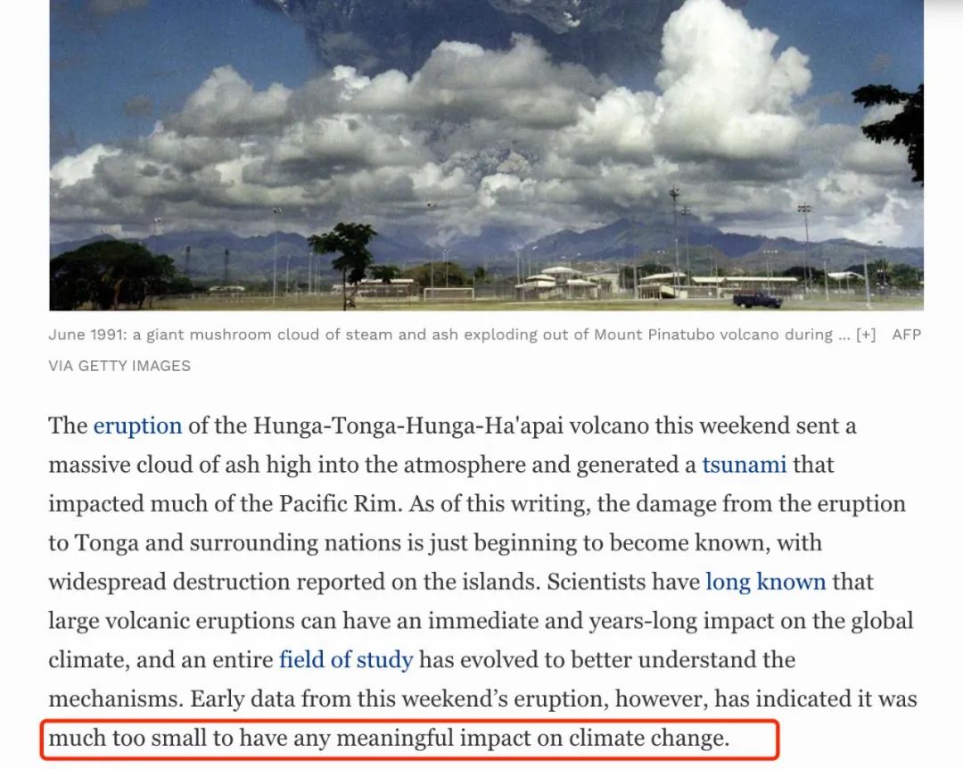 美国福布斯网站援引能源领域专家布兰登·亚历山大的话称,汤加火山喷发的早期数据表明,它的规模太小,不足以对气候变化产生任何有意义的影响。