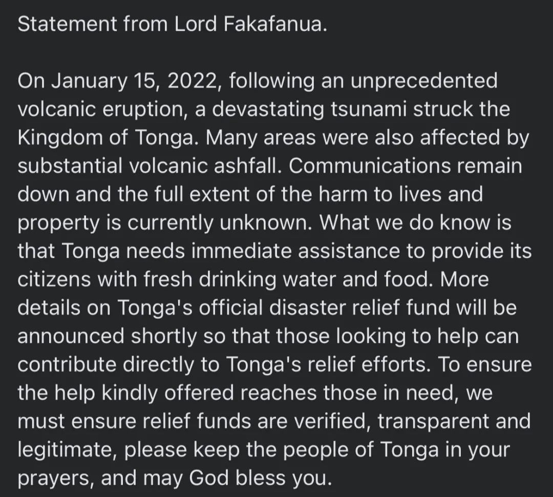 汤加议会议长法卡法努阿在社交媒体发布声明求助。他称,目前汤加通讯仍然中断,此次灾难对民众生命和财产造成的全面损害目前还不清楚……汤加需要立即得到援助,为公民提供新鲜的饮用水和食物。