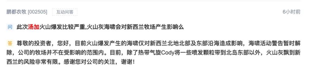鹏都农牧称,目前火山爆发产生的海啸仅对新西兰北地北部及东部沿海造成影响,海啸活动警告暂时解除,公司的牧场并不在受影响的范围内。目前,除了热带气旋Cody将一些喷发颗粒带到北岛东部以外,火山灰飘到新西兰的风险非常有限。