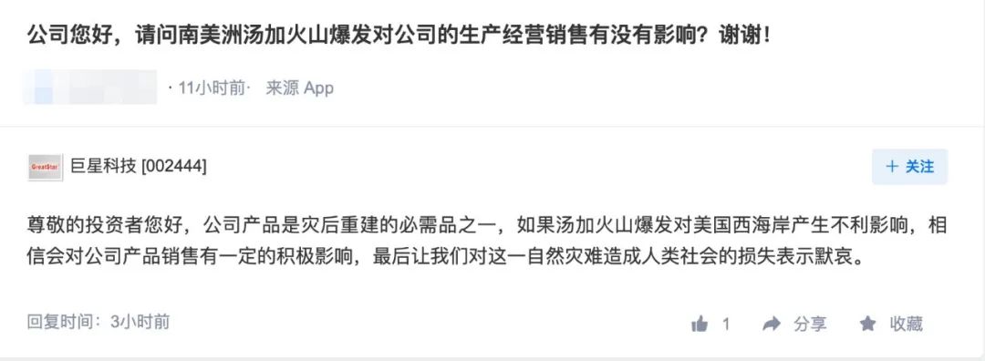 巨星科技称,该公司产品是灾后重建的必需品之一,如果汤加火山爆发对美国西海岸产生不利影响,会对公司产品销售有一定的积极影响。