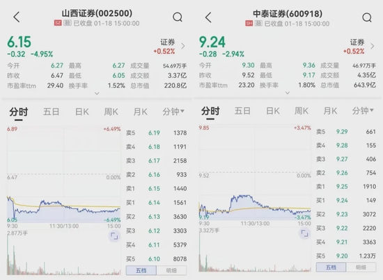 1月18日,山西证券和中泰证券大幅下跌。截至当日收盘,跌幅分别为4.95%、2.94%。