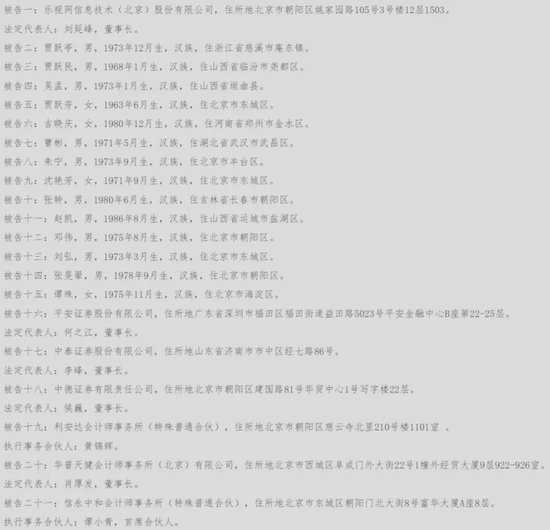 北京金融法院信息显示,被告除乐视网外,还有贾跃亭等14名自然人,中德证券、中泰证券、平安证券3家证券公司,利安达、华普天健、信永中和3家会计师事务所。