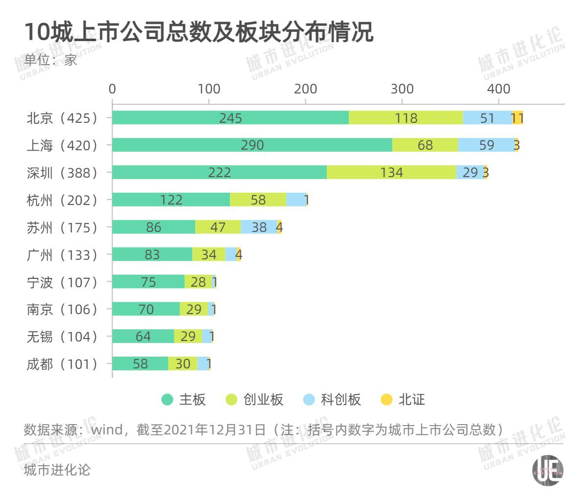 到年底,北京上市公司数量达到425家,占A股上市公司总量9.1%、占10座上市公司“破百”城市总量的19.7%;上海以5家的差距紧随其后,有420家,北、上也是唯二跨过400家上市公司的城市;深圳排名第三,388家,杭州第四,202家。其余六座城市的上市公司总量均在200家以内的水平,宁波(107)、南京(106)、无锡(104)与成都(101)以差不多的年度增量,刚好踩线“破百”。