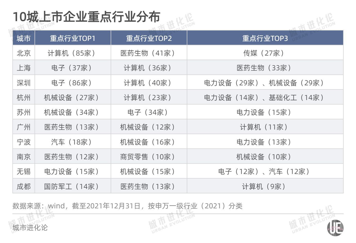 以申万一级行业(2021)为分类标准,看十城上市企业的行业分布情况。计算机、电子、机械设备、医药生物、电力设备是十座城市上市公司最集中的五大行业。其中,计算机行业的企业是最多的,北京、上海、深圳、杭州、广州与和成都,都在这个行业涌现大量上市企业。