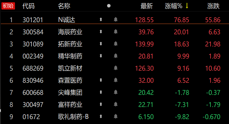 除此之外,新冠治疗药中间体/原料领域今日多只个股涨幅较大,包括森萱医药、海辰药业、拓新药业、精华制药、凯立新材等。若将时间线拉长,其中绝大多数均在今日创下近期股价新高。