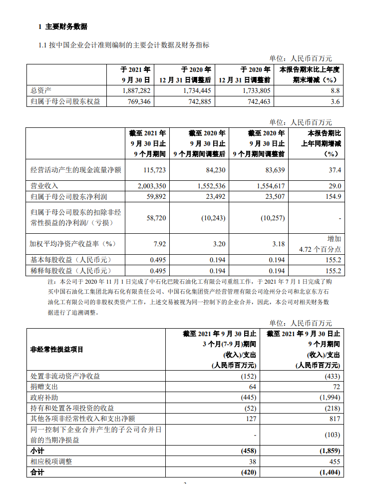 2021年10月28日晚间,中国石化发布2021年三季报。按照中国企业会计准则,前三季度公司归属于母公司股东净利润598.92亿元,同比增长154.9%;按照国际财务报告准则,前三季度公司归属于本公司股东净利润607.55亿元,同比增长148.5%。