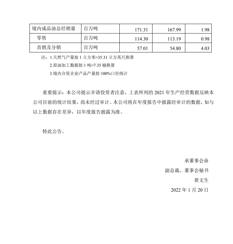 1月20日,中国石油化工股份有限公司发布2021年生产经营业绩提示性公告。公司2021年原油产量279.76百万桶,同比下降0.16%;天然气产量1199.45十亿立方英尺,同比增长11.85%。