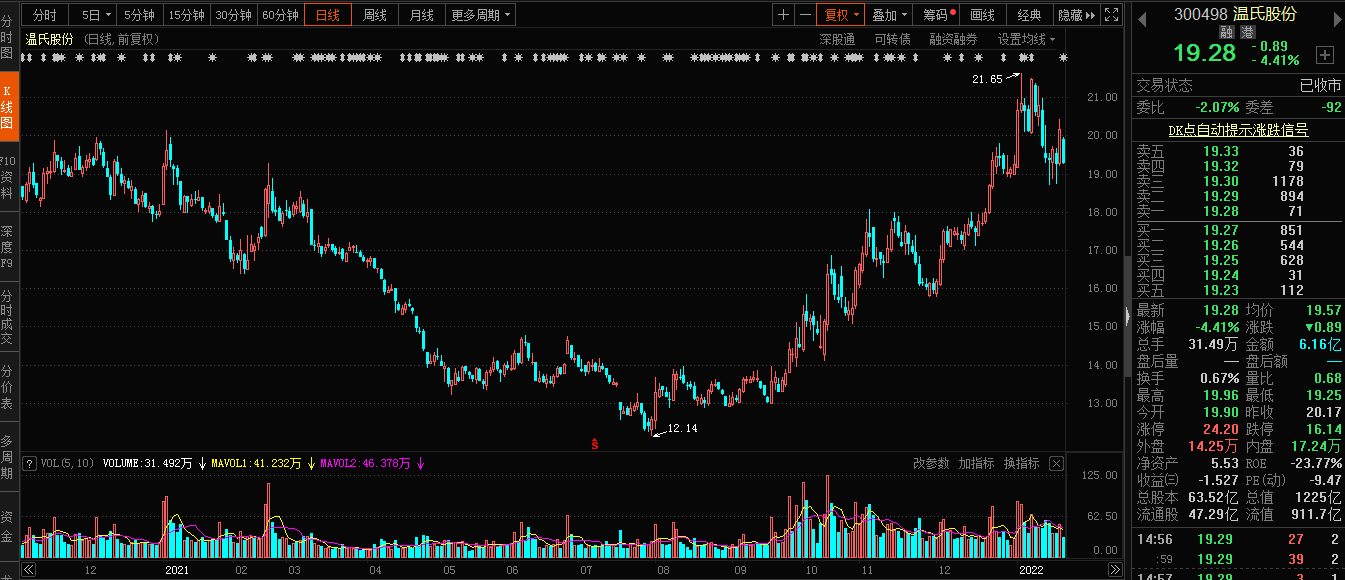 截至1月21日(周五)收盘,温氏股份报收于19.28亿元,总市值1225亿元。