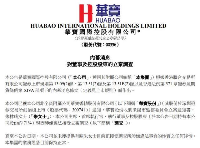 同时,华宝股份在深交所公告,公司于近日收到耒阳市监察委员会立案通知书,其决定对公司实际控制人朱林瑶的违法问题立案调查。截至目前,朱林瑶未在公司担任任何职务,未参与公司的经营管理,上述事项不会对公司日常生产经营活动产生重大影响。公司拥有持续完善的治理结构及内部控制机制。目前,公司生产经营正常。