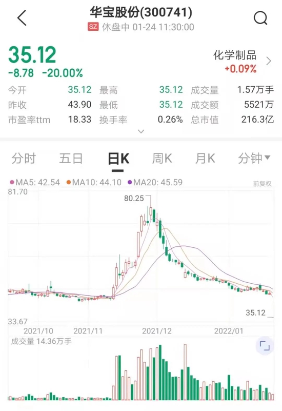 公告发布后,华宝股份开盘大跌20%封死跌停,华宝国际更是一度暴跌超75%。截至午间收盘,华宝股份报35.12元,总市值216.3亿元;华宝国际每股报收4.85港元,总市值156.7亿港元,约合人民币127.4亿元。A股和港股合计半日市值蒸发308亿元。