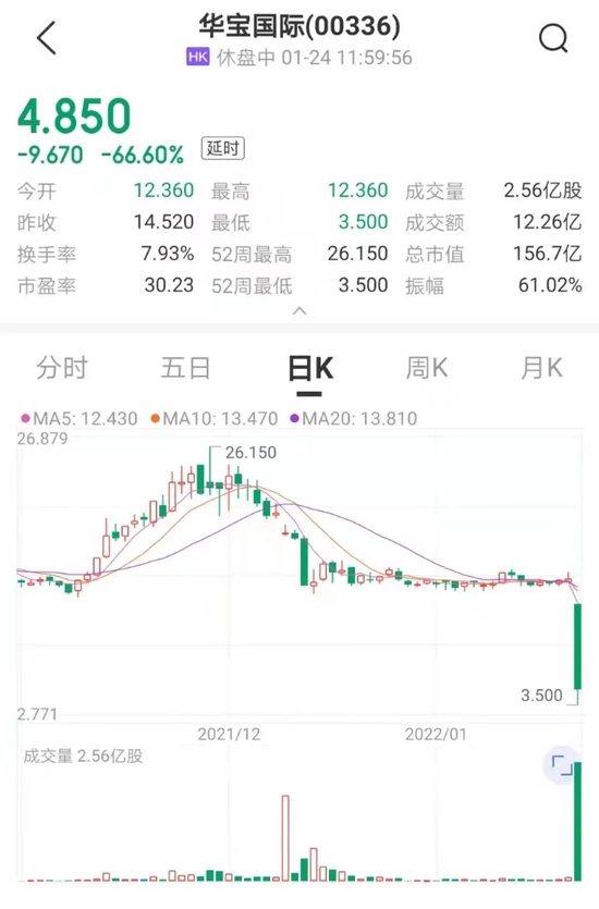 虽然公司予以否认,但公司股价坐上“过山车”。从2021年11月底开始,华宝股份、华宝国际股价一路下挫,截至1月24日午间收盘,每股分别报收35.12元、4.85港元,市值相比高点蒸发278亿元、688.3亿港元(约合人民币559.8亿元),合计蒸发约838亿元。