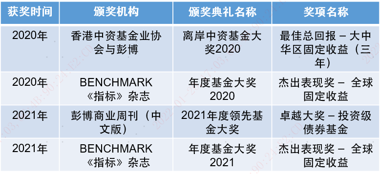 易方达(香港)精选债券基金在2020年和2021年连续两年获得BENCHMARK《指标》杂志的年度基金大奖;并于2020年获得香港中资基金业协会与彭博颁发的离岸中资基金大奖【固收、权益斩获“冠亚军”,易方达香港获“2020年度离岸中资基金大奖”】;该基金在2021年末荣获彭博商业周刊“领先基金大奖2021”卓越大奖,自2015年起至2020年的每一年,易方达香港均有其他产品获得领先基金大奖,2021年已经是连续七年获奖。【易方达(香港)精选债券基金荣获彭博商业周刊“领先基金大奖2021”卓越大奖】