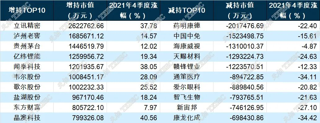2021年四季度,基金增持前三名分别是立讯精密、泸州老窖和贵州茅台,增持市值分别为262.28亿元、168.57亿元、144.65亿元;此外,亿纬锂能、闻泰科技、韦尔股份、歌尔股份增持市值均超100亿元。在第四季度,上市公司股价均有不错表现。
