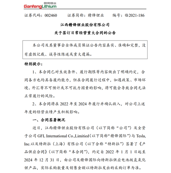 此外,赣锋锂业于2021年11月与特斯拉签署了《产品供应合同》,约定自2022年1月1日起至2024年12月31日,由公司及赣锋国际向特斯拉供应电池级氢氧化锂产品,实际采购数量及销售金额以特斯拉发出的采购订单为准。赣锋锂业指出,合同将在2022年至2024年履行并确认收入,对这三个年度的经营业绩产生积极影响。
