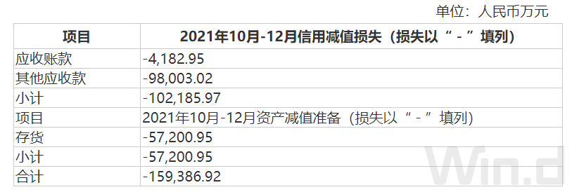 四季度资产减值准备方面,航天神禾科技(北京)有限公司订单采购与生产的存货16.34亿元,,因2021前三季度已计提10.62亿元,第四季度拟计提剩余存货跌价准备5.72亿元。资产减值和信用减值共计15.94亿元。公司第四季度计提减值的明细情况见下表:
