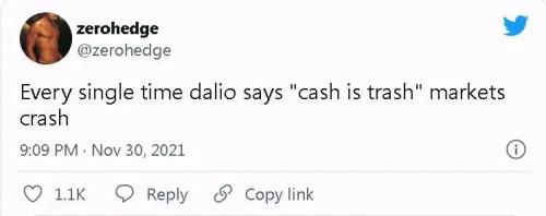 2021年,桥水创始人达里奥再一次表示现金是垃圾。2018年以来,达里奥至少是第6次在公开场合表达这样的观点。评论称,每一次这样的观点出现之后,市场都会大跌一下示意。