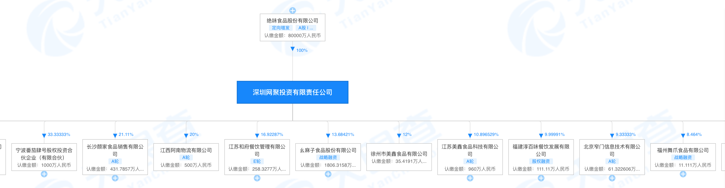 资料显示,深圳网聚成立于2014年9月12日,在绝味食品上市之前就成立了,由绝味食品100%控制。从天眼查看,和府捞面已到E轮融资,而深圳网聚是2015年入驻的。除了和府捞面之外,绝味食品还有不少投项,比如持股13.68%的幺麻子也已启动上市流程,融资到C轮的有深圳市餐北斗供应链管理有限公司,A+轮的有鲜生活冷链物流有限公司,A轮的有郑州千味央厨食品股份有限公司、福建淳百味餐饮发展有限公司、江苏美鑫食品科技有限公司、江西阿南物流有限公司、长沙颜家食品销售有限公司,天使轮的江苏满贯食品有限公司、江西鲜配物流有限公司、武汉食和岛网络科技有限公司等。