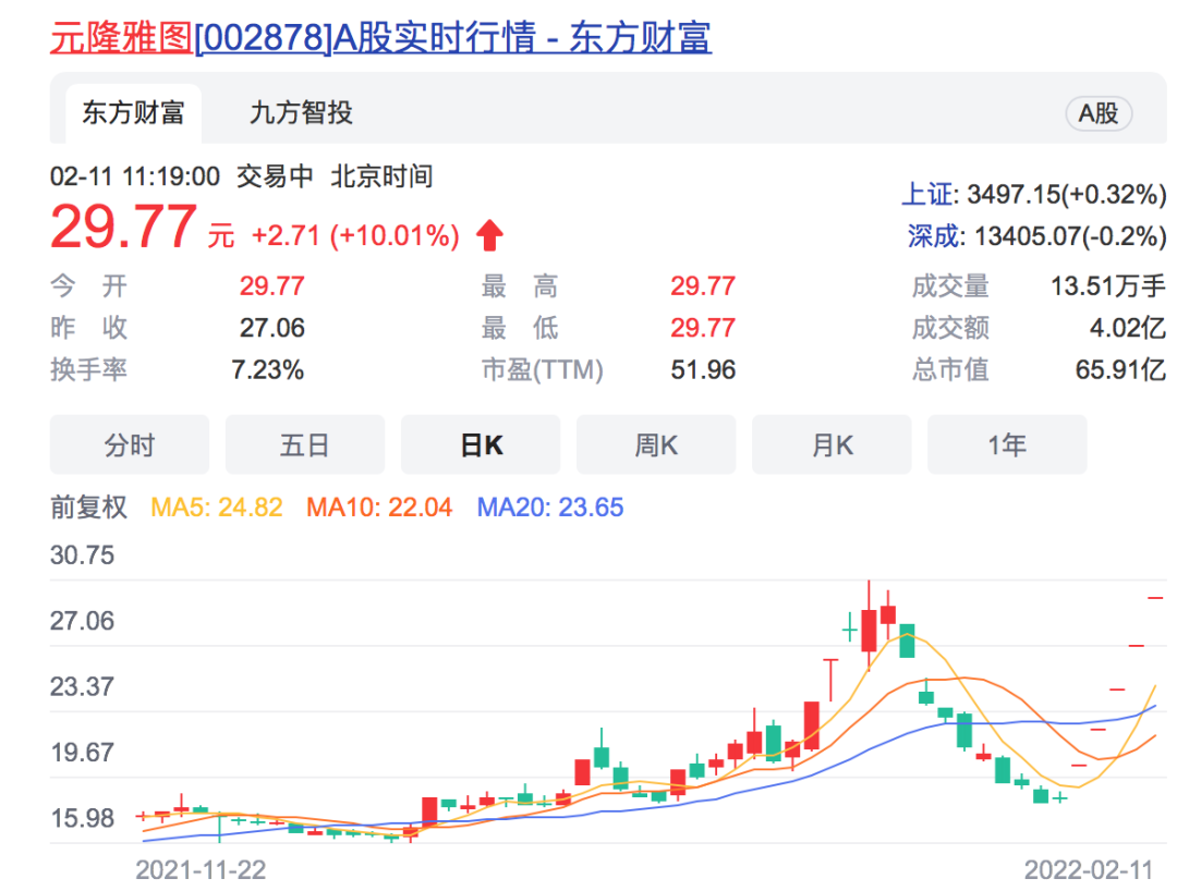 同文投控股一样,元隆雅图的上涨也是起步于2月7日。不过与文投控股不同的是,元隆雅图从2月7日至2月11日已经连续收出5个涨停板。截至2月11日证券时报.e公司记者发稿时止,元隆雅图报于29.77元,上涨2.71元,涨幅为10.01%。最近5个交易日,元隆雅图的累计涨幅已经达到61.09%。