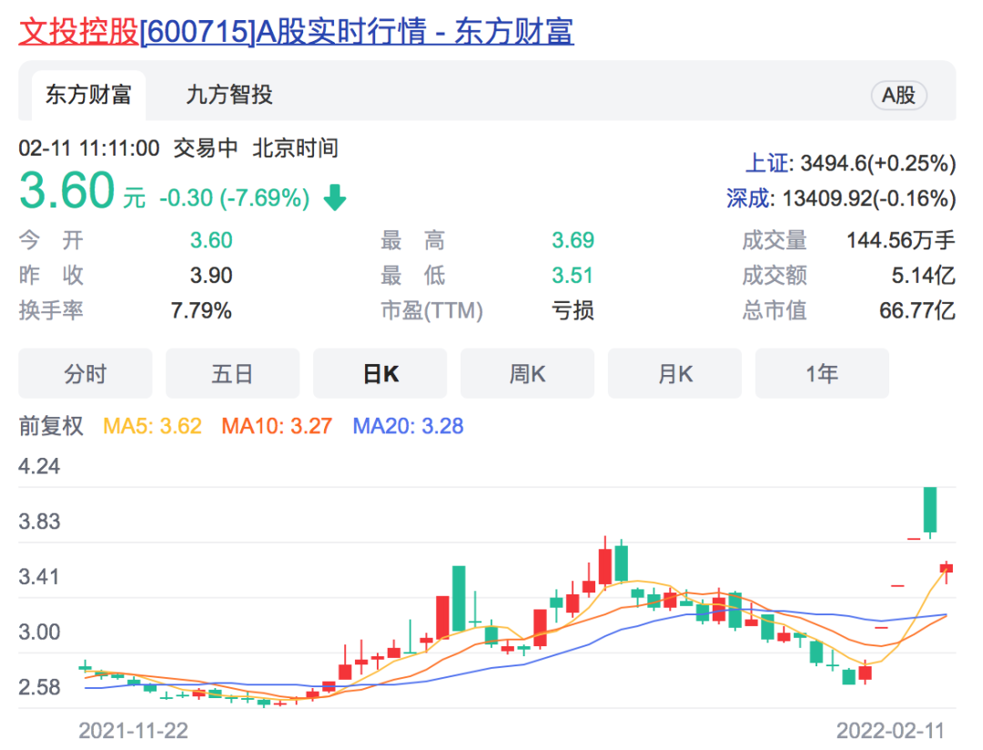 果不其然。今日,文投控股以3.6元低开,盘中最高反弹至3.69元,而后股价再度下跌,一度触及跌停板。截至午间收盘,文投控股报于3.60元,下跌0.3元,跌幅为7.69%。