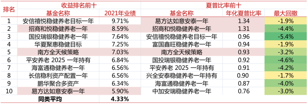 低风险定位FOF 2021年收益前十及夏普比率前十;资料来源:Wind、招商证券