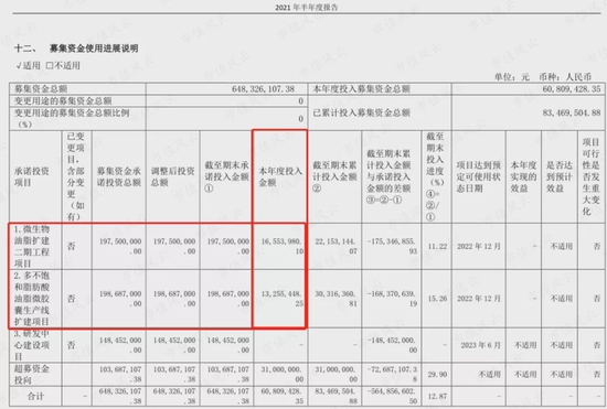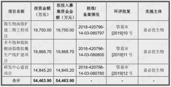 嘉必优的募投项目是3个:微生物油脂扩建二期工程项目(以下简称二期工程),多不饱和脂肪酸油脂微胶囊生产线扩建项目(以下简称“扩建工程”),以及研发中心建设。共计划投入合计5.45亿元。